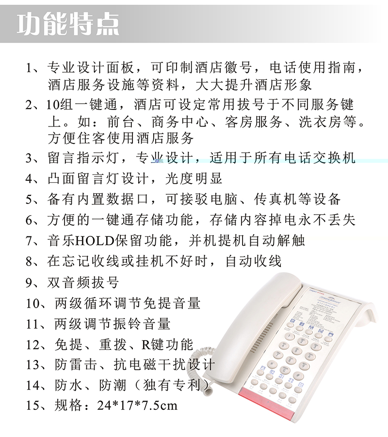 1、專業(yè)設(shè)計(jì)面板,可印制酒店徽號,電話使用指南,酒店服務(wù)設(shè)施等資料,大大提升酒店形象