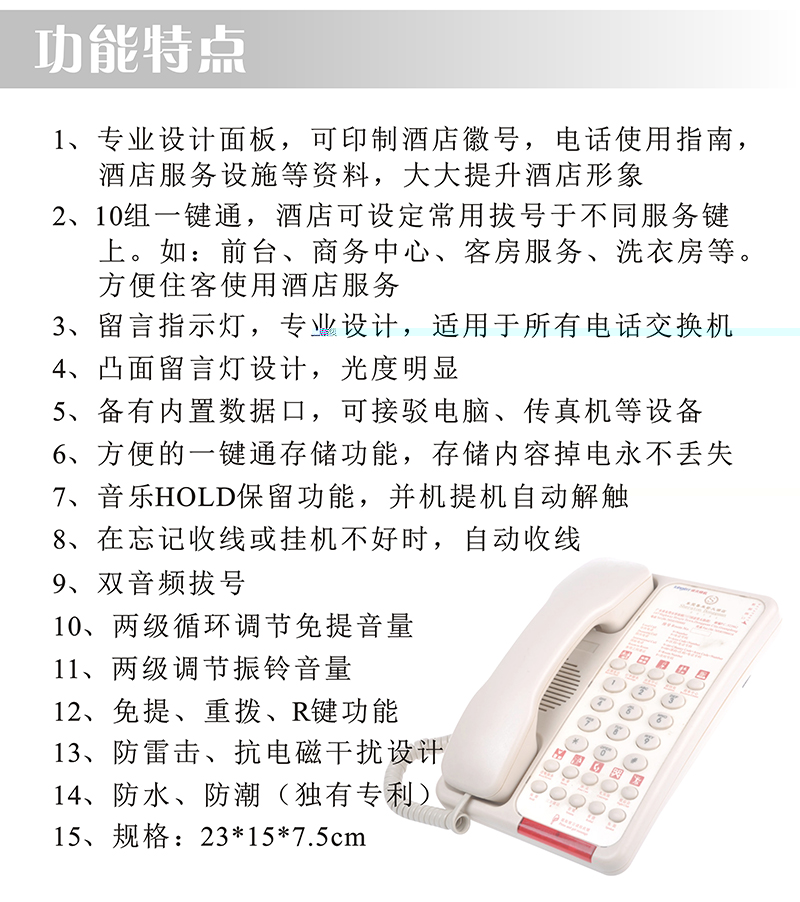 2、10組一鍵通(服務鍵),酒店可設定常用拔號于不同服務鍵上。如:前臺、商務中心、客房服務、洗衣房等。方便住客使用酒店服務